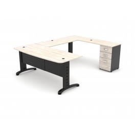 ESCRITORIO RECTO FABRICADO EN MELAMINA 19MM DE ESPESOR CON ACABADO EN LOS CANTOS EN PVC DE 1MM, EXTENSION FRONTAL. SU BASE CONSTA DE 3 PATAS TIPO "L" CON SISTEMA PARA OCULTAR EL CABLEADO, FALDON DE LAMINA CON PUNZONADO EN ALTO RELIEVE CUADRADO, FABRICADOS EN LAMINA ROLADA EN FRIO CON ACABADO EN PINTURA ELECTROSTATICA Y NIVELADORES. UN PUENTE CONECTOR Y CREDENZA ABIERTA CON PEDESTAL FIJO. CUERPO Y ESTRUCTURA COLOR GRIS O NEGRO, CUBIERTA Y FRENTES TONO A ELEGIR. MEDIDAS: FRENTE 180CM X FONDO 223CM, FONDO CUBIERTA FRENTE 75CM, FONDO CUBIERTA LATERAL 48CM.