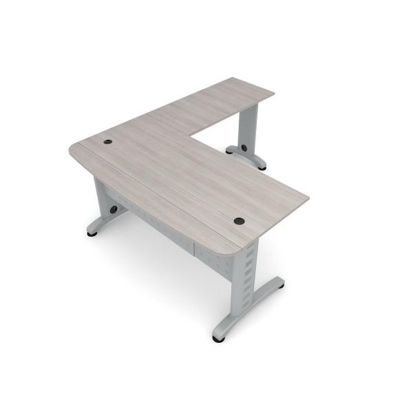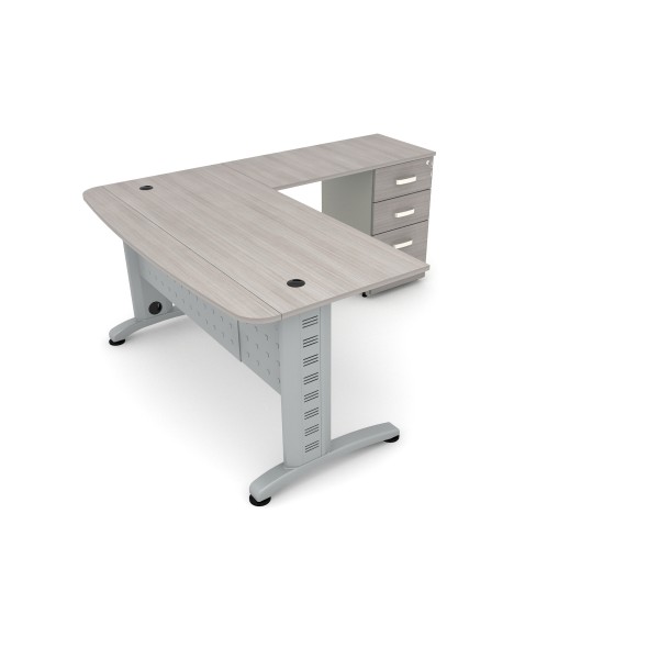 ESCRITORIO RECTO FABRICADO EN MELAMINA 19MM DE ESPESOR CON ACABADO EN LOS CANTOS EN PVC DE 1MM, EXTENSION FRONTAL. SU BASE CONSTA DE 2 PATAS TIPO "L" CON SISTEMA PARA OCULTAR EL CABLEADO, FALDON DE LAMINA CON PUNZONADO EN ALTO RELIEVE CUADRADO, FABRICADOS EN LAMINA ROLADA EN FRIO CON ACABADO EN PINTURA ELECTROSTATICA Y NIVELADORES. LATERAL CON PEDESTAL FIJO O LATERAL CON PATAS EN ACERO TIPO "L" Y DUCTOS PASACABLES (SIN PEDESTAL). CUERPO Y ESTRUCTURA COLOR GRIS O NEGRO, CUBIERTA Y FRENTES TONO A ELEGIR. MEDIDAS: FRENTE 120CM X FONDO 135CM, FONDO CUBIERTA FRENTE 75CM, FONDO CUBIERTA LATERAL 48CM.